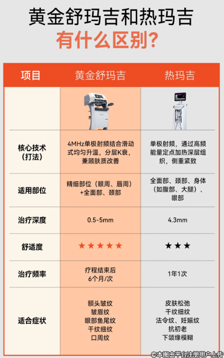 A:黄金舒玛吉适用于25~60岁,存在轻度至中度眼周以及全面部细纹、褶皱、皮肤松弛问题的人群,以及追求高舒适感,希望长效维养K衰的人群。