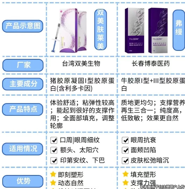 【双美胶原蛋白】:主要用于面部凹陷填充,改善眼周状态。其中凝固型(肤丽美)和非凝固型(肤柔美)在质地和用途上略有不同。