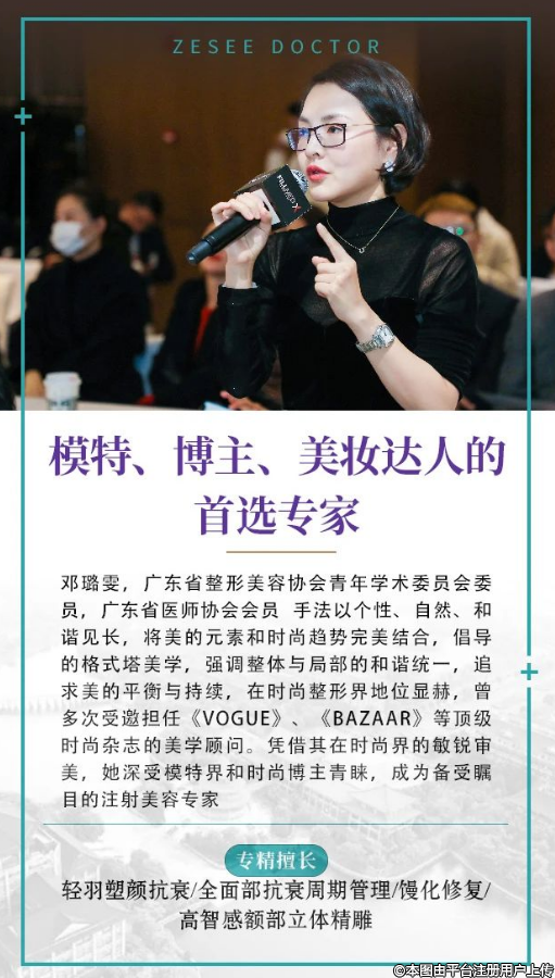 邓璐雯,广东省整形美容协会青年学术委员会委员,广东省医师协会会员手法以个性、自然、和谐见长,将美的元素和时尚趋势完美结合,倡导的格式塔美学,强调整体与局部的和谐统一,追求美的平衡与持续,在时尚整形界地位显赫,曾多次受邀担任《VOGUE》、《BAZAAR》等顶级时尚杂志的美学顾问。凭借其在时尚界的敏锐审美,她深受模特界和时尚博主青睐,成为备受瞩目的注射美容专家。