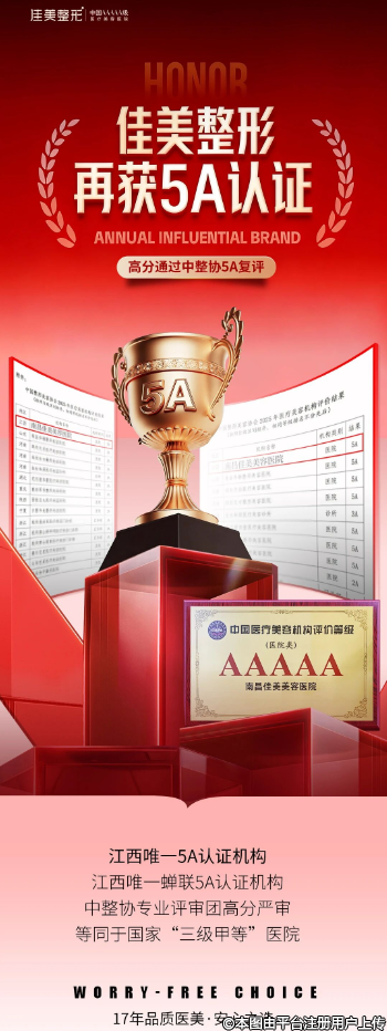 佳美整形早在2022年便率先获得江西省首家“5A级医疗美容医院”,此次再度荣获中国医美至高荣誉,充分彰显了佳美整形在临床技术、医疗水平、医疗服务、规范管理体系等方面,始终处于医美行业领先水平,是值得求美者信赖的医疗美容机构。