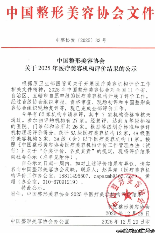 根据原卫生部医管司关于开展医疗美容机构评价工作相关文件精神,2025年中国整形美容协会对全国11个省、自治区、直辖市自愿申报的医疗美容机构开展了评价工作。